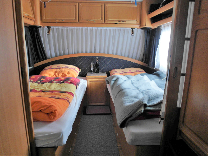 Die großzügige Sitzecke kann zu einem riesigen Bett umgebaut werden. Im Heck gibt es zwei Einzelbetten. Gegenüber von der